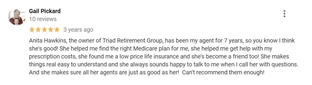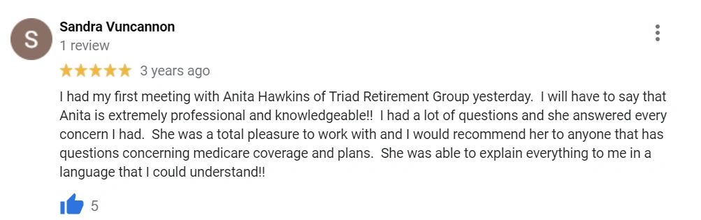 Anita started her company, The Triad Agency, in March of 2015 as an agency specializing in Senior Healthcare. In January of 2017 the agency relocated to their current address in High Point and widened their focus to provide a more holistic approach to meeting their clients insurance needs, for clients of EVERY age. Now they operate under the name Triad Retirement Group (TRG), and specialize in helping people of all ages with all of their insurance and retirement planning needs, including 401K and IRA rollovers, life insurance, Medicare plans, Vision/Dental, Long Term Care and At-Home Healthcare plans.